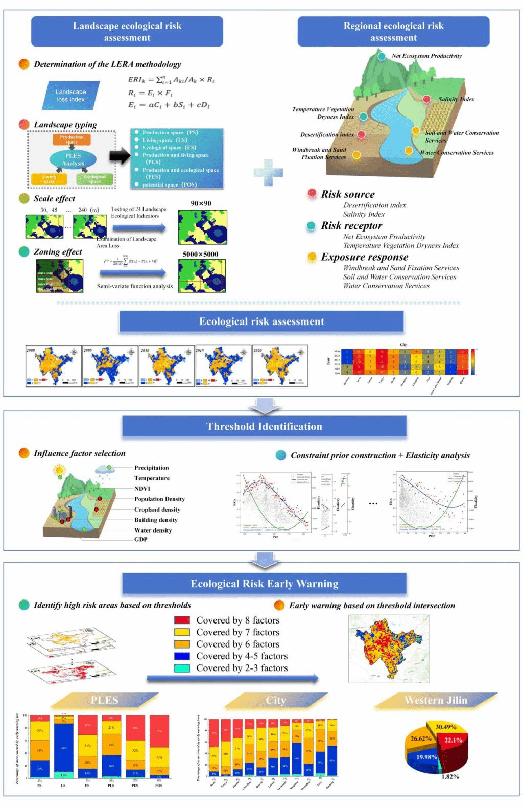 研究团队通过整合景观生态风险评价和区域生态风险评价,构建了一个综合生态风险评价模型,并在此基础上利用约束线法和弹性分析法,确定了自然和人为驱动因素对 CERA 的响应阈值,进而构建了生态风险预警模型。最终,通过验证综合生态风险评价模型和生态风险预警模型的有效性,进一步证实了研究的有效性和合理性。研究结果表明,吉林西部的生态风险预警级别较高,其中Ⅳ级预警和Ⅴ级预警分别占总面积的 44.69%(22791 km2)和 23.8%(12184 km2)。在潜在空间中,V 级预警所占比例最高(51%)。特别是通榆和镇赉的 V 级预警超过 50%,需要未来重点关注。该研究不仅阐明了多种因素与综合生态风险之间的关键阈值,还成功构建了生态风险预警模型,该模型能够直接解释高预警背后的原因,为广域生态管理和生态系统恢复提供了重要的决策支持。