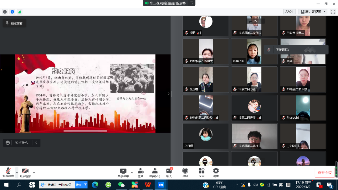 为促进同学们思想进步、境界提升、行动自觉,pa视讯集团官网各团支部组织团支部全体同学于2022年3月初开展了“学雷锋”主题云团日活动,讲述雷锋故事,分享雷锋精神,探讨对新时代雷锋精神的理解和感悟,深化对志愿服务活动的理解与认同。