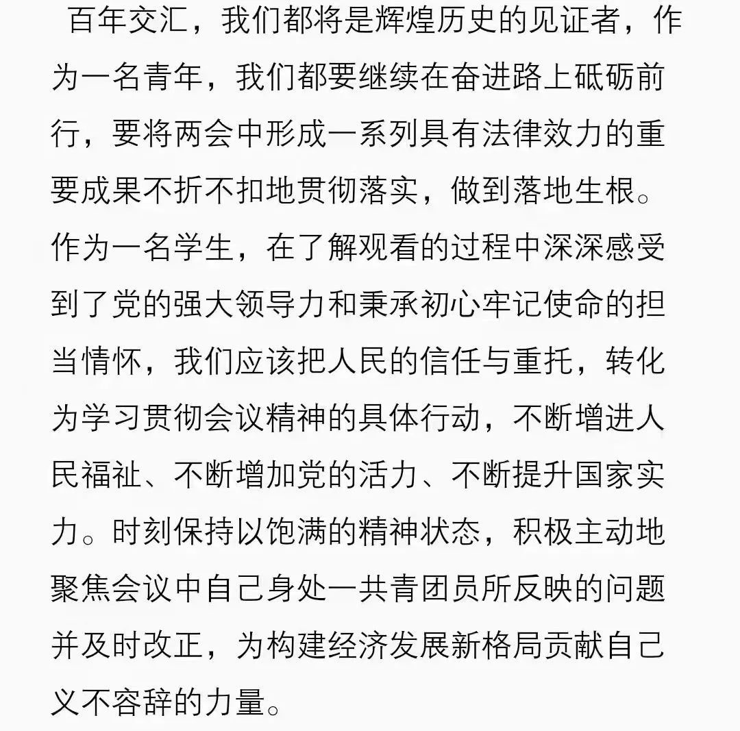 恰逢冬残奥会开幕之际,北京又迎来了“两会”胜利召开的伟大盛事。在期待着运动员们取得辉煌成绩的同时,我也在密切关注着2022年国家的发展规划。当前新冠疫情时有反扑、国际形势也变得错综复杂,我们的前进之路充满着困难与挑战。但是当我看到“两会”代表带着沉着,带着智慧,带着信心,从全国各地相聚北京,共商国是,我的心中备受振奋。我坚定地相信,在习近平总书记的坚强领导下,发挥中国新型政党制度的优势,坚持自我革命的战略思想,2022年我们国家一定能克服各种困难,取得更大的成就。我也相信在不久的时间里,呼市的疫情能够清零,我们也能回到那个心心念念、鸟语花香的校园里,能够与好朋友一起说笑打闹,能够与同学们在那教室里共同学习。当然我们在家上网课,也要努力克服一切困难,就如习近平总书记所讲的那样,不能把吃饭的工具所舍弃。